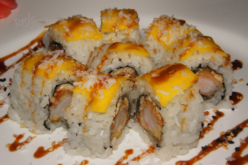 Bali Hai Mango is shrimp tempura, topped with mango, coconut flakes and eel sauce. While good, the roll was very sweet and fell a little short with flavor. -