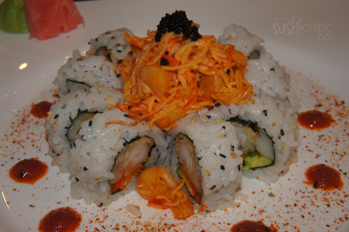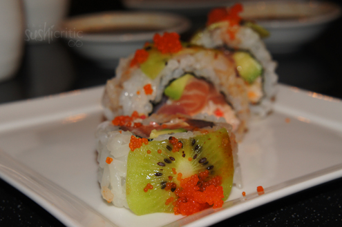 The Envy roll had salmon, tuna and crab salad inside. It was topped with thin slices of kiwi and sweet chili sauce. The kiwi, a favorite fruit of mine, was truly a treat. The roll had a perfect blend of flavor and sweetness and was on the lighter side. -