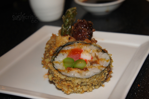 The Lust was easily a favorite of ours. Inside it was composed of tuna, cream cheese and avocado. It was topped with fried tilapia, drizzled with spicy mayo and eel sauce, tobiko and scallions. Typically we don't care for cream cheese, but didn't mind it in this roll, as it brought everything together perfectly. We have never had any sushi with tilapia before and now easily see why this roll is a favorite of their customers. The fusion of flavors, along with the tilapia crunch make this a must order. -