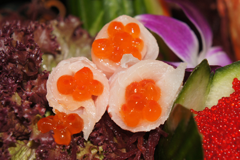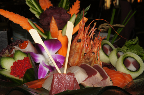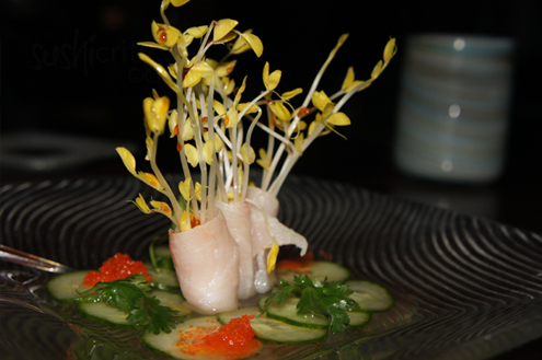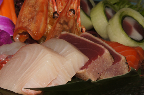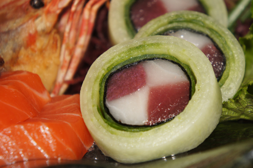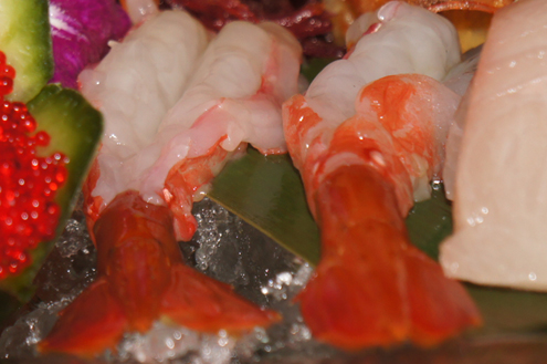 Sashimi Platter After a few sips and some edamame we dig into the Sashimi Platter Alex serves us. The impressive knife skills of the chef are in full effect here. Our platter includes: Tuna, Hamachi, Seared Tuna, Salmon, Sweet Shrimp, Cobia wrapped around Ikura and White Tuna and Tuna wrapped tight in cucumber slices.
