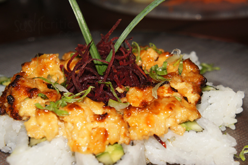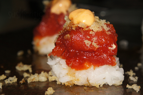 The creative chef Ryan whipped up a creation of his own for us to enjoy. It was chunks of spicy tuna, topped with tempura flakes and lightly covered with eel sauce and spicy mayo. These little bites size pieces were awesome. The fish was soft and creamy, it was light and the perfect mix of spicy sweet. While you won't find this on the menu, the closest option is the Spicy Dragon Roll. However if may be worth inquiring about. -