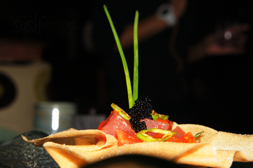 We switch to a spicy dish called Tuna Shishito. It is diced slices of tuna, shishito peppers, diced tomatoes, masago and garnished with jalapenos, kimchee sauce and black tobiko. Everything was served in a freshly made, giant wonton shell. This dish was very flavorful and on the spicy side. Shishitos are spicy/sweet green Japanese peppers and paired well with the jalapenos and kimchee sauce. The main ingredients in Kimchee sauce are typically chili pepper, garlic, and paprika leading to its red color and bold spice. Overall this was a very enjoyable dish. -