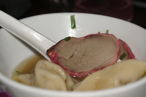 We are both a little under the weather and order Wonton Soup in hopes of healing our throats. Alex puts the soup down and the smell of it makes my mouth water. The soup is full of large pieces of bok choy, wontons and the biggest slices of barbequed pork I've ever seen. The pork is succulent and stands out. The wontons easily break with a spoon and soup is busting with flavor and infused with a touch of ginger -