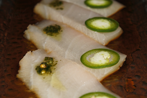 Next we took a mini sushi roll break and tried the Spicy Yellow Tail Sashimi. It was thin slices of Hamachi, topped with jalapenos served in an exquisite sauce. The sauce was a mix of garlic soy sauce, shiso peppers and jalapenos. The fish is amazing and the heat from this dish is subtle, hitting you afterwards. -