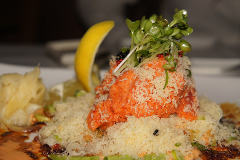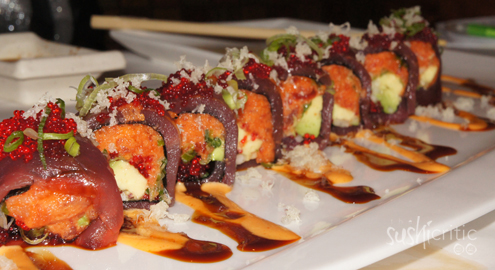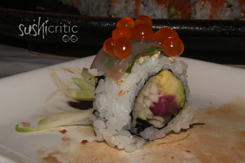 Inside this roll was spicy tuna, tempura flakes and avocado. On top was deliciously seasoned black pepper tuna and tobiko. This roll was perfect as is and required no sauce at all, and we love our sauces. -