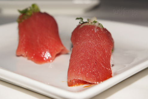 Both of these pieces of sashimi above came from the belly of the Big Eye Tuna. Toro refers to the fatty part of the fish, its belly. Otoro comes from the underside of the fish close to the head and chutoro comes from the belly in the middle and back of the fish. Otoro is a higher grade than chutoro. Taste wise both are delicious, but the otoro is a fattier cut giving it an almost "butter like" quality and it goes down very smooth.