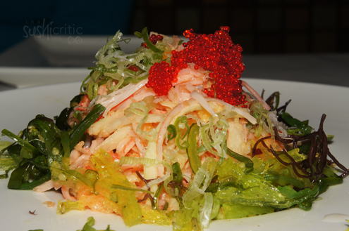 Shredded Kani, spicy sauce, tempura crunch and mango chunks. This dish is a great appetizer. It was very light and flavorful. The dish had just the right amount of mangos and sauce, while the seaweed added just the slightest crunch. It would be great pick for those just easing into sushi as there is no raw fish. -