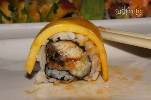 Elyse was craving some eel and wanted something beside eel and avocado so we asked them to make a custom roll with eel and cucumber inside and mango on top. They delivered and as you can see this roll had thick mango slices that surprisingly stayed put. We recommend this roll if you like something on the sweeter side. -