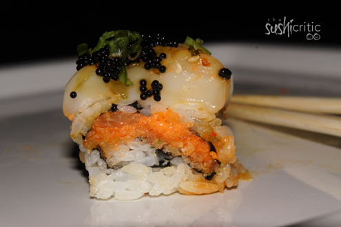 Best way to describe this roll is - "melts in your mouth". Spicy yellow-tail onion and crunch inside. Scallops and tobiko outside. Drizzled with eel sauce. Very soft, spicy and unique. Very light on your stomach. -
