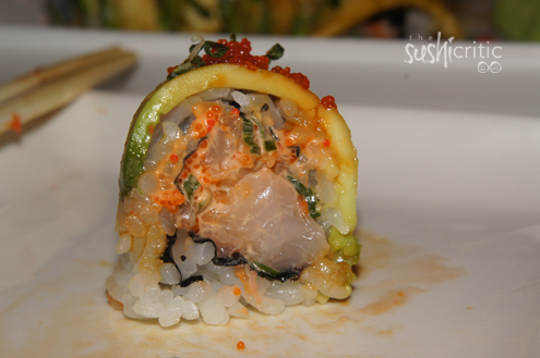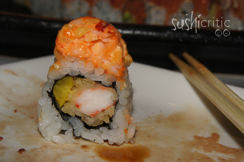 This is a new favorite. It has sweet shrimp combined with jalapenos and a spicy mayo tobiko sauce inside. The roll is topped with slices of avocado and all of the flavors blend really well together for the perfect mix of spicy and sweet. -