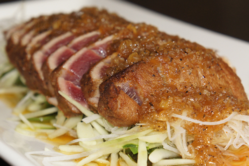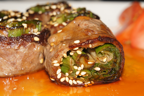 We are served a dish we have never had before, Beef Negimaki. This is a traditional Japanese dish, believed to be originated in the Kanto region of Japan. The dish is also available with chicken if you prefer. The Beef Negimaki is cooked slices of beef wrapped around cooked scallions. The dish is garnished with sesame seeds and teriyaki sauce. The scallions are surprisingly large and folded neatly inside the beef. This beef is well cooked and seasoned and along with the scallions, has a slight chew to it. The flavors are great and we enjoy this very much. -