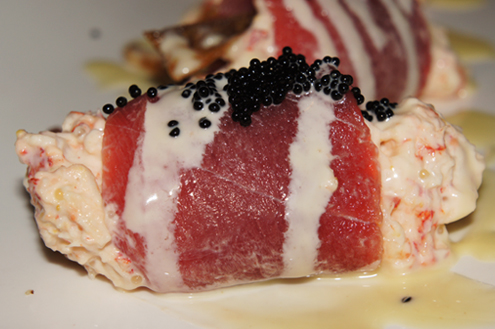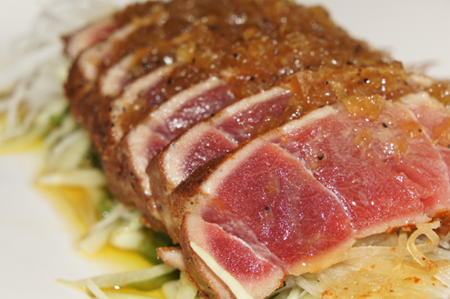 Our first appetizer arrives and it looks amazing. It is Cajun. It is thick slices of cajun tuna with an onion soy dressing. Cajun spices are primarily composed of ground cayenne, paprika, garlic, onion and black pepper. The fish sits on a bed of seaweed salad, cucumber and shredded radish. The dish looks appetizing and has a taste to match. The numerous pieces of tuna are thick and perfectly seasoned. It melts in the mouth and easily falls apart. The salad underneath is a nice compliment and provides a little crunch to the tender fish. The onion dressing has noticeable pieces of the vegetable in it and a great salty, pepper flavor. We want to save room for more, but somehow keep taking another piece itis that good. -