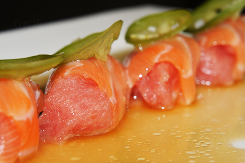 Next we are brought a special appetizer available that evening called Salmon Toro Tartar. It is pieces of toro wrapped in salmon sashimi and topped with large slices of jalapenos. It is covered with a yuzu sauce. Yuzu is an Asian citrus fruit with a light tart taste. Some think it's a hybrid fruit that originated from a combination the sour mandarin and Ichang papeda, a hard citrus plant with lemon characteristics. The fish in this dish tastes great together. The toro is soft and thick and the salmon is fresh, tender and strong. The jalapenos on top are very mild, working well with the yuzu, and add a little crunch. The dish quickly disappears. -