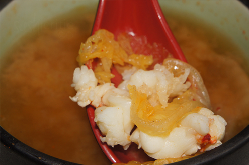 We can't seem to shake our colds and order some soup in hopes it will help. We are brought a tasty Spicy Lobster Soup. The soup is a spicy broth with large pieces of lobster and vegetables like cabbage and onion. The soup is smooth with a kick at the end. The lobster is slightly chewy but flavorful and moist from absorbing the soup. Very tasty. -