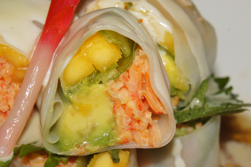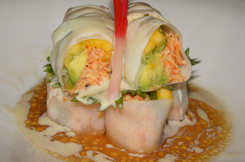 Next is the Tokyo Wrap. This dish is spicy crab, mango, avocado and jalapeno wrapped in rice paper, with no rice whatsoever. It is served with a special ponzu sauce created by the chef and drizzled with mayo. Ponzu sauces are citrus based, tart and thinner in consistency. The roll is beautifully served, layered on top of each other in a bowl with the sauce on the bottom. The roll tastes amazing. It is sweet from the sauce and mango but well balanced with some spice from the jalapenos. The sweetness hits first and the heat follows. The roll is incredibly light and the spicy crab inside is fresh and tasty. It's a must order. -