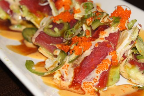 Tuna Pizza arrives next. This is another dish we have noticed recently on a lot of sushi menus. A chef in Montreal claims she originated this dish back in 1992 and while there is no proof, we would like to thank who ever did. The pizza is composed of tuna, creamy avocado, jalapenos, scallions and tobiko all placed on a cracker. It is drizzled with spicy mayo and eel sauce. The pizza is served a little different than most, already sliced and intricately plated, making it a little bit harder and messier to eat. The crust is very crunchy. While pretty good, the avocado has almost a guacamole consistency and overpowers the dish. -