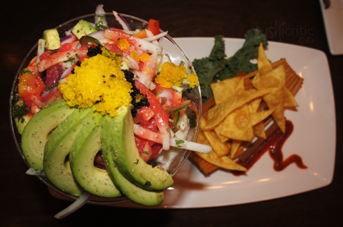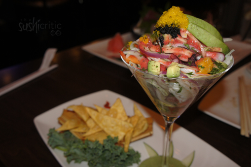 Ceviche came next. We've have never had it at a sushi restaurant before. Ceviche is composed of fresh fish, fruit and sometimes and vegetables. Our dish was served with strawberry lime vinaigrette and homemade chips. The dressing was wonderful - light and refreshing. I tasted octopus, crab, shrimp, onions, tomoato, avocado, oranges and jalapenos to name a few. For the Florida heat, this dish is a perfect pair. -