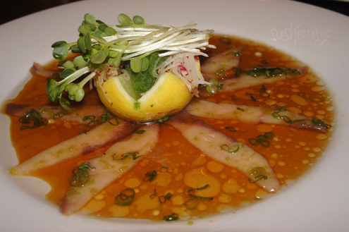We ended our week of sushi at Seito in Sandlake. Seito is to sushi as Peter Luger is to steak. The family owned business has a large sushi bar, which was manned by at least 4 talented chefs. The booths were large and inviting and the decor was pleasant with pendant lighting, textured walls and fusion art around the restaurant. The manager Chris sat us and next we were in the hands of their chefs.