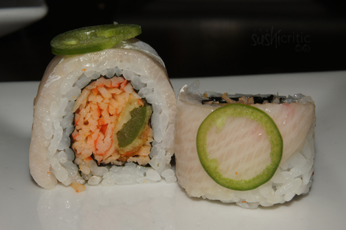 Mango Tango was next. It had shrimp tempura, snow crab salad, mango, avocado and cucumber. The mango chunks were very large and the roll had a great thickness. The flavors inside are another favorite of ours and it did not disappoint. -