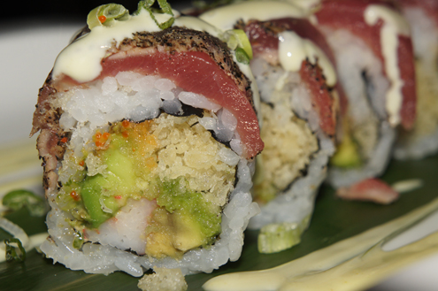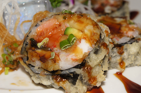 Next we order the Bonzai Roll. It is spicy kani and avocado inside. It is topped with black peppered tuna, wasabi mayo and scallions. The tuna has a very nice spice to it and the light kani salad is a good contrast to it. The roll is good, but would be better with less tempura flakes. While we enjoy some crunch, the flakes overpower the taste of the fish. -