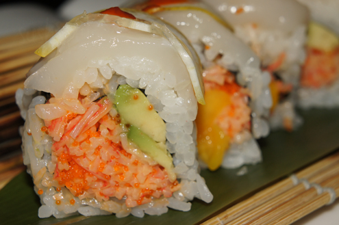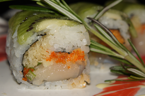 The Saxon, a special from that evening, is next. It is spicy scallops, scallops mixed with spicy mayo and tempura, inside. It is then topped with kiwi slices and a special sauce. Kiwis, which used to be called Chinese gooseberries, are a green fruit with a sweet, yet tart taste. They can be compared to a mixture of banana pineapple and strawberry. The special sauce on this roll has a sweet and sour taste, which enhances the flavor of the roll. Otherwise it is a little lackluster as the scallops are not that spicy. The kiwi does add a nice touch and they stand out more than anything else. -