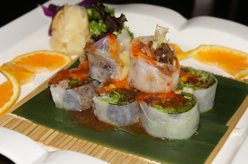 Finally it is time for the sushi rolls and we start with the Crispy Duck. We have never had duck in a sushi roll before and are excited by the description of this roll. It is crispy duck, cucumber, mango and lettuce all wrapped in soy paper. It then topped with a special sweet chili sauce. Presentation wise it arrived on a large bamboo leafand mat decorated with orange wedges. When a menu reads crispy duck, it is typically referring to Peking Duck. Peking Ducks have a thinner skin that other breeds, allowing them to crispy nicely when roasted. Once properly fattened the ducks is killed, cleaned and pumped with air to separate the skin and fat. It is then soaked in boiling water, covered with maltose syrup and hung to dry. It then roasts to that beautiful shiny brown color. The duck in this dish is rich and has a nice smoky taste, which pairs well with the sweet mango. The other ingredients, along with soy paper over nori, provide a nice soft compliment to the crunchy meat. -