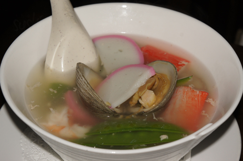 Next arrived two bowls of soup for us to try. The first was Seafood Soup. It was clear broth with pieces of crab, clams, shrimp, scallops, white fish, mushrooms and snap peas. The mushrooms were huge and all of the fish was tender. Typically the white fish found in Asian soups are made from various forms of white fish (sole, butterfish, etc.) combined with cornstarch, chicken stock, ginger root and a little parsley, sugar and cucumber. The broth had a nice light flavor, little hints of garlic and chicken, and it definitely warmed us up. -