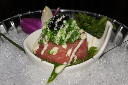 Toro Tartar is served next. It is pieces of chopped toro combined with an olive yuzu sauce. It was then topped with green and black tobiko and served in a bowl set over ice with blue blinking lights. Green tobiko are fish eggs which have been colored by wasabi and black tobiko has been colored by the ink of a squid. The toro was super fresh and a prolific flavor. Toro is one of the most sought after cuts of fish, coming from the fatty underbelly. Majority of the time it is harvested from the bluefin tuna. The dish is very flavorful, with a hint of salt and tart. We enjoy it very much. -
