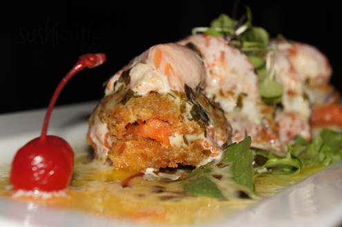 The Fried Roll arrives next. This roll is loaded with smoked salmon, kani, eel, avocado, shrimp and ginger. The entire roll is covered in tempura batter, fried and covered with the same sweet and sour sauce. The roll is a little on the heavy side, between the tempura and the sauce. There is a strong salmon taste and the torched salmon is actually quite enjoyable. Additionally strong in taste is the ginger. Ginger is a versatile spice and has many medical benefits, such as decreasing pains from arthritis, nausea and other stomach ailments. Taste wise ginger is spicy, but more in a zesty, tangy manner versus the spice taste you get from peppers. If you don't mind rolls on the heavier side, then this would be a good pick. -