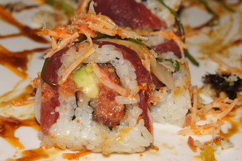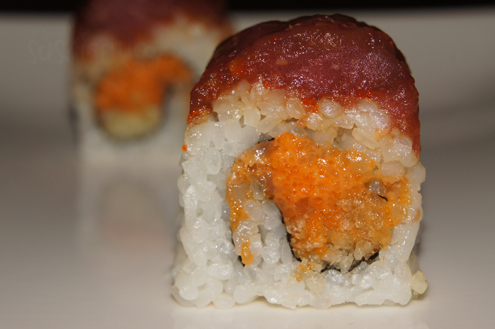 It is time to get back to the sushi though. We try the Alliana Roll. It is spicy yellowtail mixed with crunchy tempura flakes inside and topped with crunchy tuna on top. When Sushi Ya tops a roll with fish they do it right, nice and thick. The yellowtail and the tuna on top are well seasoned and bursting with flavor. Their spicy tuna mixes are again right on the mark, with a nice heat. This roll is simply delicious. -
