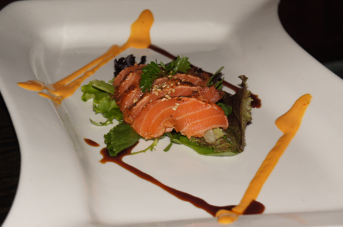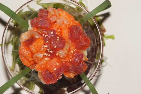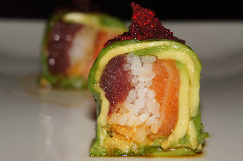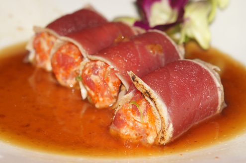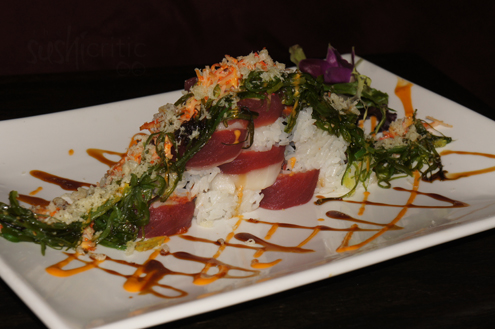 The Iron Tuna arrives next. It is seared tuna wrapped around crunchy spicy tuna. The pieces of stuffed sashimi are plated with an onion infused ponzu sauce. The fish is super tender and nearly melts in the mouth with each bite. Their spicy tuna is superb, being light on the mayo and heavy on the spice. Nowadays most restaurants use Srircha, a hot Thai sauce, for their spicy fish mixtures due to its ease and great flavor however some still rely on the traditional Japanese spice togarashi, a blend of seven spices. Overall this dish is very enjoyable and a great appetizer. -