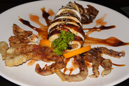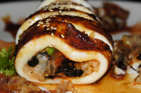 Nearly full we are brought the Calamari Dragon. Though Calamari is an Italian word meaning squid, it is a staple in Japanese cuisine and the Japanese consume the largest quantity of squid worldwide. This dish is unlike any others we have seen before and is eel, avocado and sushi rice stuffed into the body of a calamari. It was then cut into thick pieces, like a specialty sushi roll. The tentacles from the calamari are fried and displayed around the front, crafting the dish to look like a small fish. The entire thing is lightly covered with eel sauce and plated with sweet chili sauce. The fried tentacles have a slight chew but nice crunch. The slices of stuffed calamari are wonderful and luscious and somehow they stay perfectly wrapped. There is a strong taste from the bbq eel and unagi sauce. The calamari is a little chewy, but not rubbery in the slightest. The roll is very large and filling and is a nice alternative to just typical fried squid. It is also a steal for its price. -