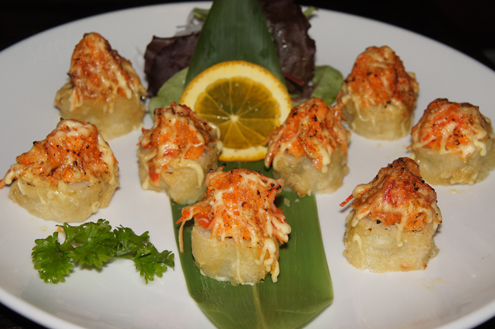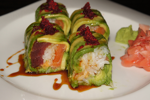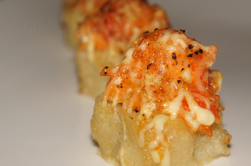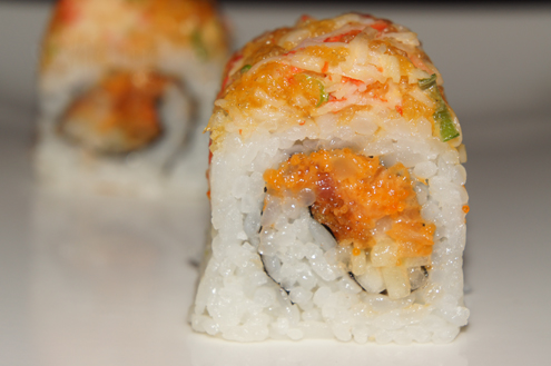 We try the Crazy Monster Roll. This is a spicy tuna roll that has been fried and topped with spicy crabmeat and mayo. A blowtorch is then taken to the top of the roll. The torching gives the entire roll a great smoky flavor. The heat from the flame often melts the fat of a fish giving a soft, fatty flavor and smooth texture. In this case it also warms and melts the mayo. Other than they smokiness, there is a nice spice to the roll, though it is a little heavy for our liking and strong on the mayo. If you love crunchy and fried food though, this is right up your alley. -