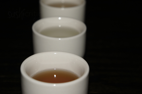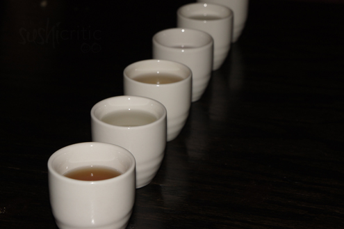 Sake Samples - Flavored We enjoy a little more sake at this point. We sample a few other flavors, but this time choice to have them served warm. Historically sake was always served warm. The reason is first and foremost because the process of making sake was created before refrigerators were. The second is due to it being stored in wooden casks for long periods of time and serving it warm helped to cover some of the unpleasant taste of the fermenting process. Presently none of those are factors and the overall brewing procedure and ingredients used has become more refined. We sample espresso, chocolate, almond and coconut. All of them have a pleasing aroma, with the almond sake having the strongest scent but the most artificial taste. The coconut was a little bland as well. However, the espresso and chocolate are quite lovely with both being a smooth and sweet treat.