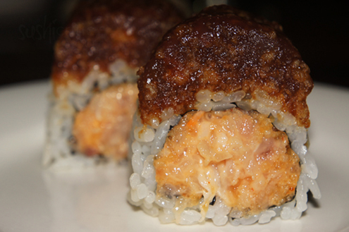 Next was the Anthony. It was spicy salmon and tempura flakes inside with seared white tuna and a miso sauce on top. The inside is crunchy. The white tuna is soft. The slightly salty miso compliments the pepper seared fish. The roll is on the spicy side, but not too much to handle. The flavors fuse well. -