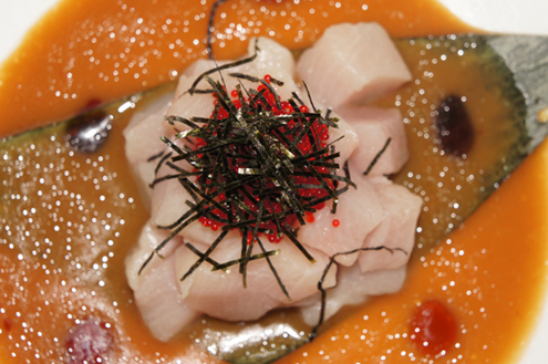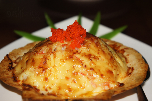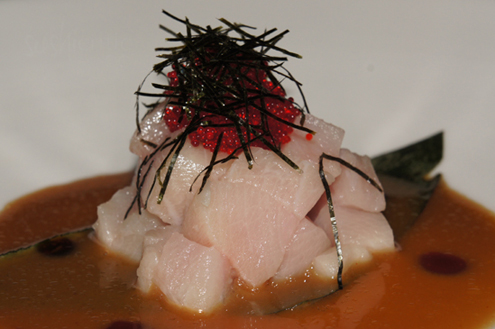 Diced, sashimi styled Yellowtail came next. Hamachi is a tender fish and best when harvested in the winter, when it has a higher fat content. The dish was large pieces of yellowtail hamachi, piled high and topped with crunchy red tobiko. Red tobiko is the natural color of tobiko and it is not colored or seasoned with anything. The fish sat on top of a special blended miso sauce, which was mild and slightly spicy. The fish was super fresh and nearly melted in our mouths. -