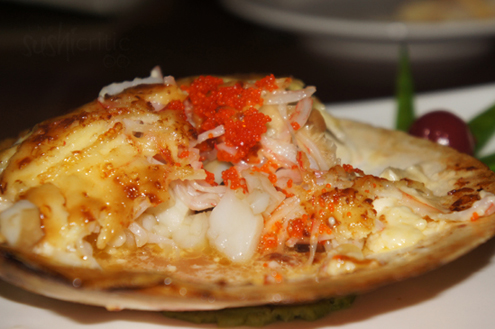 Next we are brought something incredibly light in contrast, a Kani Salad. It was shredded kani, orange tobiko and matchstick cucumbers mixed lightly with mayo. In general tobiko has a smoky, slightly salty taste and a crunchy texture. This tobiko was orange, which means it was likely colored with yuzu, a tart Asian citrus fruit. Kani salad is easily becoming a favorite. It is a great starter, being light and refreshing. The cucumbers and tobiko give it a light crunchy. Very good. -