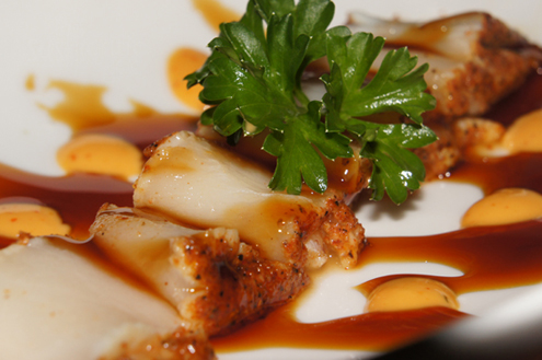 Next up is a hot appetizer called Dynamite, and that it was. The dish is a mix of scallops, crabmeat, shiitake mushroom, and Japanese mayo. Shiitakes are native to Asian cultures where they are both a delicacy and used medicinally. The mixture is then placed on a large half shell and baked to perfection. Again Kelly makes a good wine recommendation. We crack into the golden brown top and are greeted with by a warm, creamy texture. The fish has been diced into large chunks and is incredibly luscious. A little on the heavy side, the dish has a great flavor and creativity to boot. We find ourselves scrapping the shell hoping more will magically appear. -
