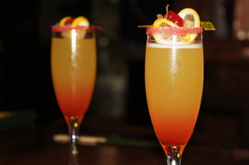 We sit down and Kelly brings us two drinks that she created, called "A Peach Blossom". They have pineapple juice, grenadine, absolute peach vodka, peach schnapps and are rimmed with sugar. Each drink is adorned with a lemon slice and a cherry. They are light, refreshing and go down easily. -