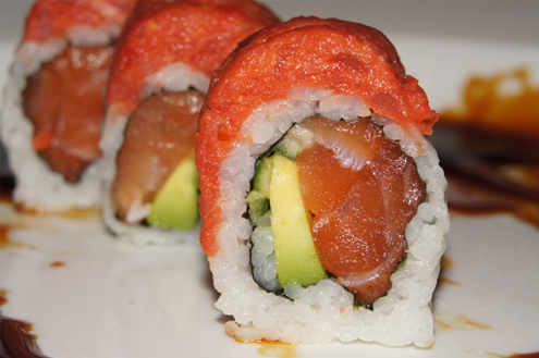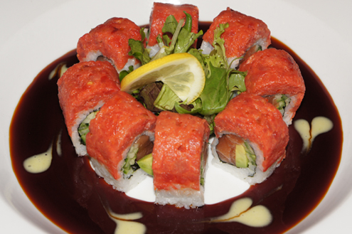 Chef's roll continues the sushi roll trend. This roll is salmon, avocado and cucumber inside. It is topped with spicy tuna, a coconut cream and an eel glaze. When thinking coconut cream, do not confuse it with coconut milk as it is thicker and has a mild, non-sweet taste. The coconut cream is not visible and perhaps mixed into the tuna, but if so the taste is very subtle. The spicy tuna, delicious again, is generously wrapped around the roll and provides the most flavor out of all the other ingredients. The salmon, while good, is more of an undertone. -