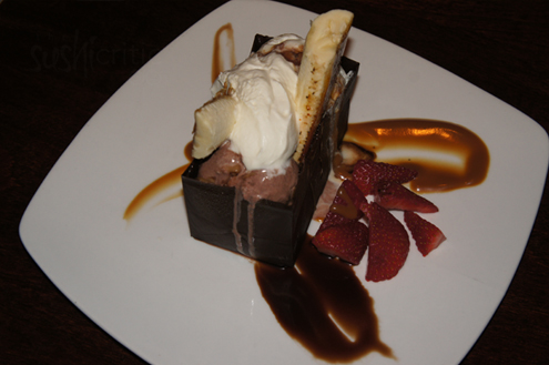 The famous Chocolate Bag dessert arrives even though we are bursting at this point. Warning, this dessert is seriously loaded and definitely meant to share. It starts with a large rectangular box crafted out of chocolate. The box is filled with scoops of chocolate, vanilla and coconut ice cream. A banana, cut in two and covered on one side with a harden sugar, sticks out of the box. Then the whole thing is topped with whipped cream and plated with drizzles of caramel sauce, chocolate sauce and garnished with fresh strawberries. Oh my! The dish is obviously sweet and very rich. The bananas are a tad too sugary for my liking, but the coconut ice cream is exceptional. It you love chocolate this is right up your alley. -- -