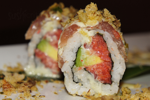 Our first sushi roll, the very popular Crazy Tuna, is brought to us. The roll has spicy tuna and avocado inside. It is then topped with seared tuna, fried leeks and wasabi mayo. Leeks are members of the garlic and onion family, tasting like a hybrid of mild onion and cucumber. This roll has a great flavor. Their spicy tuna is very well seasoned and spicy, one of the best we've had, not saucy or drenched in mayo. The leeks provide a delicious crunch, a nice change from the typical tempura flakes. We can see why this one is a best seller. -