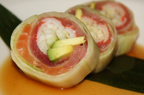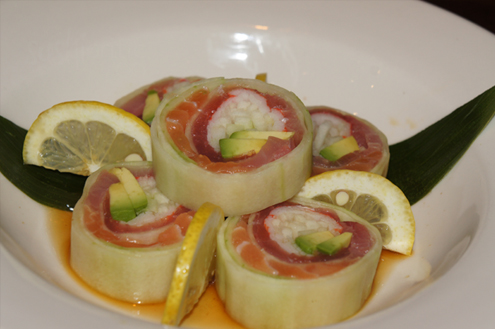 Next arrives a sushi roll from their nightly specials, the Rainbow Naruto. It is pieces of tuna, salmon, yellowtail, kani kama and avocado rolled in thinly sliced cucumber and served in a mustard soy sauce. Anytime the world "naruto" appears on a sushi menu it means the rolls will come wrapped in cucumber, with no rice. Plus the term "rainbow" refers to the different and colorful fish inside or on top. At first glance, we thought about not ordering this roll, thinking it may be too "Plain Jane", but we are pleasant surprised at how tasty it was. The fish is pure and super fresh. The cucumber is perfectly sliced, providing a contrary crunch to the soft fish. Although it is served with a mustard soy sauce, there is a hint of citrus. Overall, very good. -
