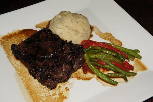 So clearly we are pretty full, but can not resist the Skirt Steak that arrives. Skirt steak, picked for its flavor over its tenderness comes from the plate of a cow. In our dish, the large piece of meat is served in a house marinade with mashed potatoes and a medley of asparagus and red peppers. The mashed potatoes are rich and the vegetables are crisp. The skirt steak is nice and thin, perfectly cooked medium rare. It is very tender, not tough at all and contains minimal amounts of fat. I am not much of a red meat eater, but this steak is very good. The marinade was light and bursting with flavor. Michael enjoys stuffing himself with this one. -