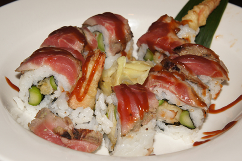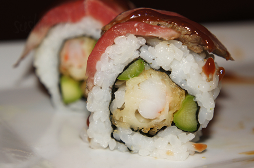 We are eager to try the Surf and Turf roll, a Japanese twist on the popular combination. The roll has shrimp tempura and asparagus inside. It is then topped with seared filet mignon, which comes from the tenderloin of a cow and is a very tender cut of meat, and finished with a steak sauce. The steak sauce is on the thick side, tasting like a smoky barbeque sauce and provides most of the taste to this roll. The roll is on the bland side and would have been more enjoyable had the steak been seasoned first. -