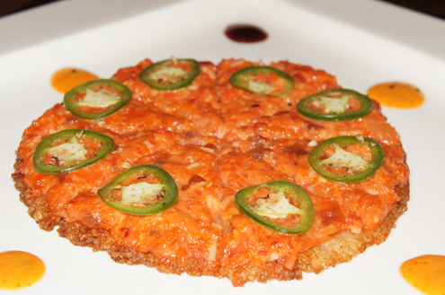 Thom Thom Sushi Pizza is next. The crust is made from sushi rice and is topped with tuna, salmon, kani, cucumber and jalapenos. The fishes on top are all blended together, forming more of a wonderfully spicy tartar. The crust is made from sushi rice that has been flattened into a round circle and flash-fried. Out of all the pizzas we have tried, this looks the most like a "traditional pizza". It is not covered with spicy mayo or eel sauce, but instead plated with small dots of it so you can add as much as you'd like. This is a nice change and just a little dip in both is all you need. The crust is slightly chewy, but that is because it has sit for a while so if you order this dish eat it quickly. -