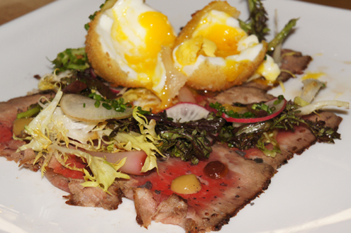 Next came the NY Strip Carpaccio. Many places do fish versions of Carpaccio with an Asian flare, but this was the way Carpaccio started - with beef and a mustard sauce. The dish starts with thin slices of NY strip steak that is lightly seared and topped with pickled ramp and a miso mustard sauce. The dish was served with a mix of local frisee greens that was topped with a fried soft boiled egg. Frisee is the outer part of curly endive and a ramp is a type of wild leek that has a thin white bulb on the bottom, resembling an onion, but opens with a flat green leaf on top. Plus for those who do not know, a soft boiled egg is like a hard boiled egg, just not cooked as long so the outside is hard but the yolk is not solid. We crack into the egg and let the yolk run down over everything. We take a bite of everything together and wow. All of the flavors blend seamlessly together. The beef is perfectly cooked, the greens are fresh and crisp, the sauce is tangy with a hint of sweet and the egg is juicy. A very creative and perfectly executed dish that doesn't last for long on our table. (4.5/5) -