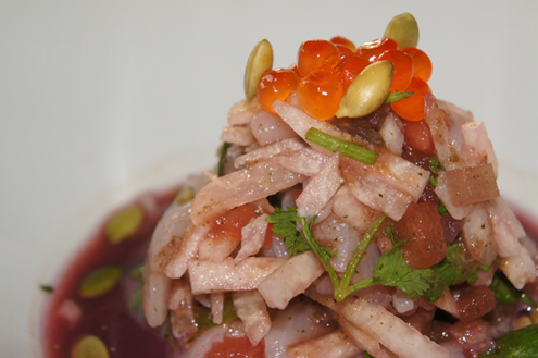 We are served our first dish of the evening Scallop Ceviche. It is one of their specialyys that evening. It contains fresh local scallops, combined with a watermelon gazpacho. The entire combination sits on top of avocado puree and is garnished with ikrua and sunflower seeds. Gazpacho is essentially cold soup. Traditionally it is tomato based and includes raw vegetables though over the years it has come to include a wide variety of ingredients. Many fruit versions of the soup are available and watermelon is a great fruit to use as it is light and mild. The dish is sweet and refreshing with a unique flavor. The avocado puree at the bottom is smooth and delicious. The scallops are super fresh and hold the flavor of the gazpacho very well. Within the ceviche you pick up on the tomatoes and cilantro. This is a great dish and we easily finish it. -