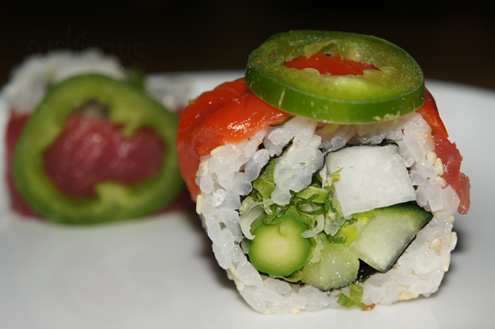 The Jalapeno Roll is cucumber, daikon, asparagus and scallion inside. It is topped with alternating strips of salmon and tuna and thin slices of jalapenos. Daikon, Japanese for "large root" is a member of the radish family. It is very crunchy with a mild flavor. Overall the roll is quite crunchy between the vegetables and the jalapenos. The jalapenos give off a serious heat and mask the other flavors a tad. We both prefer the salmon topping to the tuna. This is a good, crunchy, spicy roll, but lacks a little flavor. -