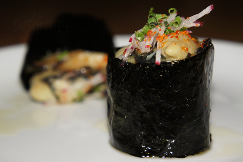 Next was Kumamoto Oyster sushi. These oysters are known for their deep shells and slightly fruity flavor. We have eaten oysters as sashimi and of course served in their shells but we have never had them sushi style before. The sushi is diced oysters served in a light garlic butter sauce on top of a small amount of rice and wrapped in nori. It is delicious.